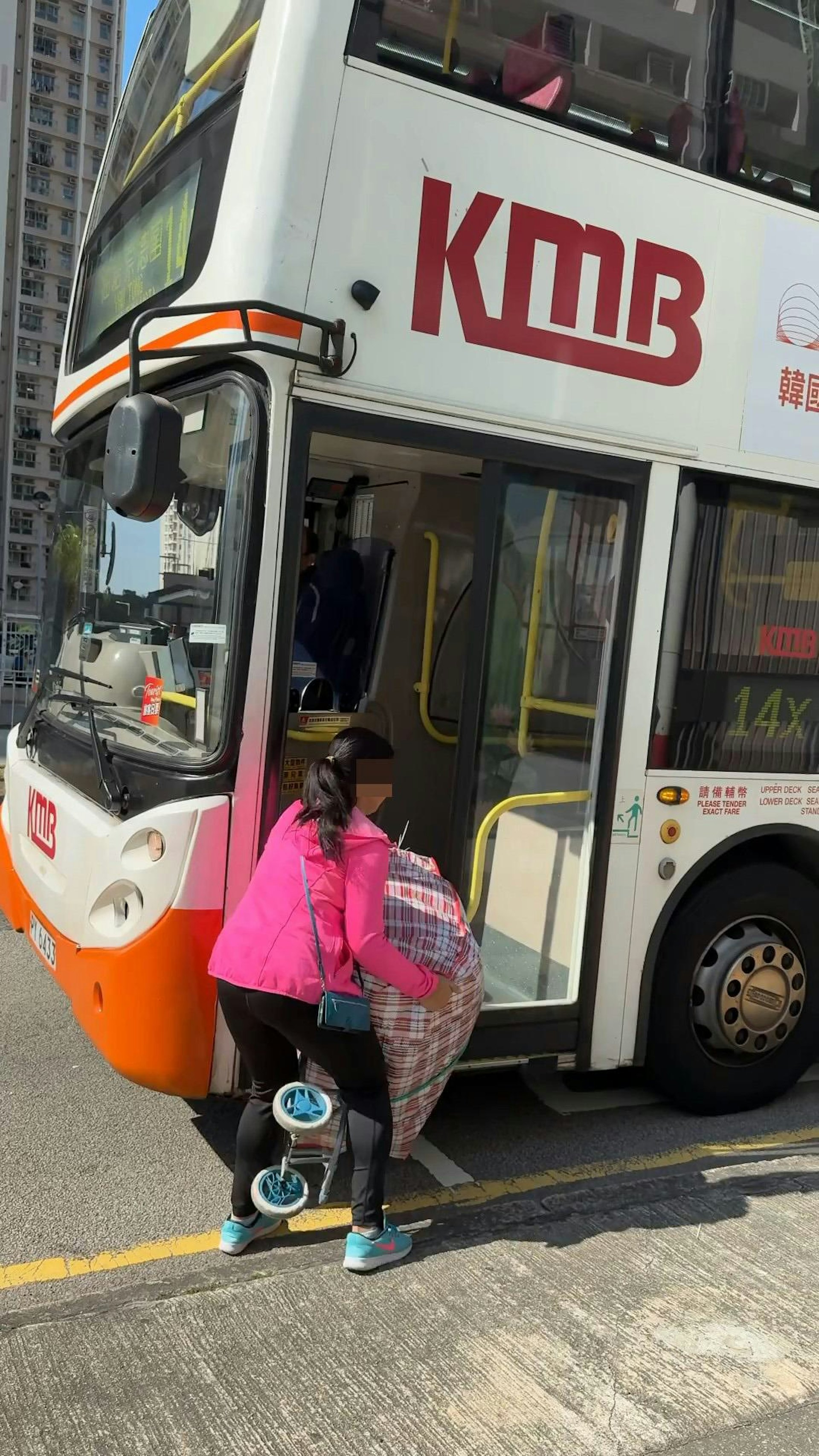 曾在巴士上遇到一位穿高跟鞋的女士,左手拖行李箱,右手看手機,長披肩從脖子滑下,她兩手忙於照顧三樣東西,人和行李箱搖擺不定,自己仍未到站卻站在門邊,阻礙其他人下車。
